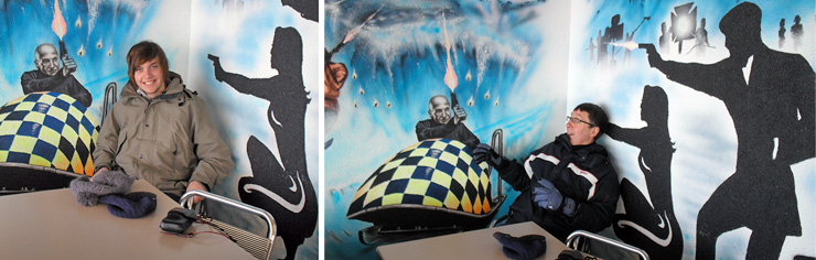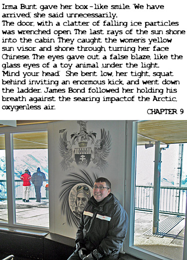 After lunch we went back to the gift shop to purchase a few souvenirs before going in search of the entrance to the circular exhibition room. This was found to be down a long white passageway adorned with scenes from the film. Beyond the entrance we found a large room with two projectors which can be activated to screen either the history of the Schilthorn railway or scenes from OHMSS. The room, which has windows going right the way around it, had a rather Bondian effect in that when you press the button to start the projector the shutters would come down blacking the room out for the screenings. Then when the film had finished the shutters would automatically go up again! |