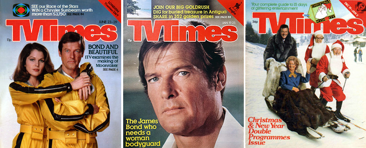 TVTimes celebrated the 40th anniversary of James Bond in the cinema was with a series of four different souvenir covers featuring Sean Connery, Roger Moore, Timothy Dalton and Pierce Brosnan. Inside a 9-page tribute included an interview with Pierce Brosnan, and overview of the 20 films in the series and the usual features on girls, gadgets and cars. George Lazenby was relegated to a small photograph (printed the wrong way round) on the Timothy Dalton cover. Lazenby was also also absent (along with Timothy Dalton) from the set of four souvenir covers issued in 2012 to celebrate the 50th Anniversary of James Bond in the cinema, although at the time ITV no longer held the rights to screen the James Bond films on UK television. |