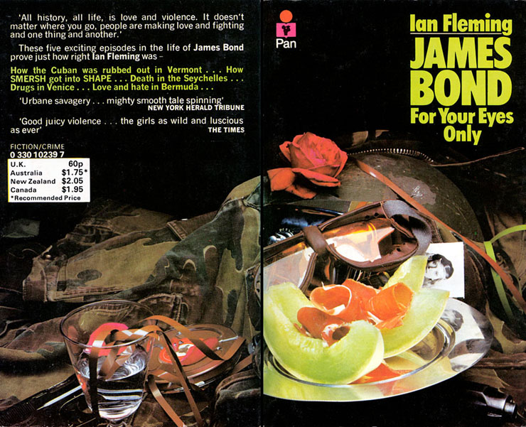 The cover of the ‘still-life’ edition of THE SPY WHO LOVED ME features a Tommy-gun, a red-handled ice-pick and a burnt photograph of Vivien Michel. A barely visible bottle of sleeping pills and gold cross are also placed amongst the feathers of a shot-through pillow. Perhaps the most obscure item is the concrete toadstool on the back cover, which is mentioned only once in the novel at the end of chapter six. The FOR YOUR EYES ONLY cover included items from several of the short stories in the anthology such as the camouflage jacket, motorcycle goggles and helmet featured in FROM A VIEW TO A KILL, and melon and prosciutto ham from Bond's meal with Kristatos in RISICO. The un-spooled tape used to record Colombo and Lisl Baum's conversation is from the same story. The black & white photograph is of Mary Ann Russell from the opening story, and a single red rose cleverly represents the fake one which enables Bond to discover the underground headquarters of SHAPE also mentioned in FROM A VIEW TO A KILL. |