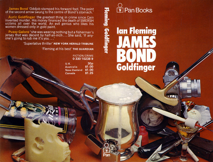 The wrap-around covers for each of the new titles all feature a black & white photograph of one of the female characters in the novel, surrounded by objects described by Ian Fleming in the story. GOLDFINGER has the photograph inserted into the lens of a pair of binoculars, so this could be said to represent Jill Masterton as she helps Goldfinger cheat at Canasta in chapter four. The cover also includes a gold-plated golf club and Dunlop 65 golf ball used by the eponymous villain in chapter eight; a silver tankard of pink champagne, and almost hidden by a piece of gorgonzola cheese on the back cover, is a crab claw. The last three items are described by the author as part of a meal Bond enjoys with Mr. Du Pont in chapter two. Du Pont's plain gold Zippo lighter can also be seen behind the PAN logo on the spine of the paperback. Jill Masterton's Revlon nail polish and a Leica camera are also mentioned in chapter four. The PAN designers have gone to great lengths to find the exact branded items the author describes, even down to the bottle of Enzian Schnapps Bond drinks in chapter 14. One of Bond's three-banded Morland cigarettes can also be seen beside his Walther PPK, underneath a steel arrow used by Oddjob when he captures Bond and Tilly Masterton in the same chapter. |