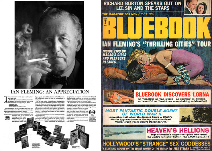 The Macao chapter from the Thrilling Cities collection then appeared in the October 1964 issue of the men's magazine Bluebook. In typical lurid fashion, the cover announced the story as ‘Ian Fleming's “Thrilling Cities” Tour - Inside tips on Macao's Girls and Pleasure Palaces...’. The cover featured a stylish illustration by prolific paperback and film poster artist Robert McGinnis. The artwork had already appeared on a pulp paperback edition of the 1950 thriller Night Without Sleep by Elick Moll in 1962. Robert McGinnis would later go on to paint the artwork used on the film posters for Thunderball (1965), Casino Royale (1967), You Only Live Twice (1967), On Her Majesty's Secret Service (1969), Diamonds Are Forever (1971), Live And Let Die (1973) and The Man With The Golden Gun (1974), becoming the most prolific poster artist of the James Bond film series. McGinnis would also provide artwork of Roger Moore in a space-suit for the 1979 Jove paperback movie tie-in of JAMES BOND AND MOONRAKER by Christopher Wood, and would later paint the cover of The Sunday Times Magazine Supplement which featured the UK debut of 007 IN NEW YORK on November 7, 1999. |