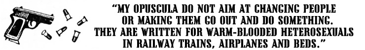 The Craft of writing sophisticated thrillers is almost dead. Writers seem to be ashamed of inventing heroes who are white, villains who are black, and heroines who are a delicate shade of pink. I am not an angry young, or even middle-aged, man. My books are not “engaged.” I have no message for suffering humanity and, though I was bullied at school and lost my virginity like so many of us used to do in the old days, I have never been tempted to foist these and other harrowing personal experiences on the public. My opuscula do not aim at changing people or making them go out and do something. They are written for warm-blooded heterosexuals in railway trains, aeroplanes and beds. I have a charming relative who is an angry young litterateur of renown. He is maddened by the fact that more people read my books than his. Not long ago we had semi-friendly words on the subject and I tried to cool his boiling ego by saying that his artistic purpose was far, far higher than mine. The target of his books was the head and, to some extent at least, the heart. The target of my books, I said, lay somewhere between the solar plexus and, well, the upper thigh. These self-deprecatory remarks did nothing to mollify him and finally, with some impatience and perhaps with something of an ironical glint in my eye, I asked him how he described himself on his passport. |